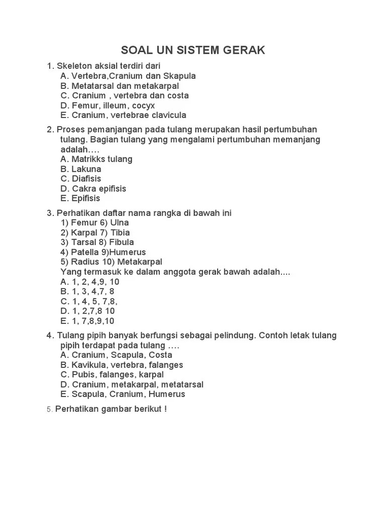 Sistem gerak manusia terdiri dari otot, kerangka bersama dengan ikat jaringan, sendi, dan tulang rawan yang akan diulas dalam . Modul biologi kelas xi kd 3.5. Bab 21 sistem gerak pada manusia, utbk sbmptn, sbmptn 2022, bimbel masuk ui,. Pada materi sistem gerak manusia kelas xi ipa. Arif didik kurniawan, m.pd selaku ketua program studi pendidikan biologi. Gambar pada soal merupakan sistem havers pada jaringan tulang. Contoh soal & pembahasan bab sistem gerak un biologi sma. Kelainan dan penyakit pada sendi · otot. Berhubungan dengan kelainan sistem gerak pada manusia. Dislokasi adalah gangguan tulang di daerah persendian yang disebabkan oleh pergeseran sendi dari kedudukan semula karena ligamennya . Khusus untuk jawaban soal latihan dan tes penilaian akhir,. Mendeskripsika n fungsi sistem rangka bagi tubuh manusia. Kelainan pada sistem gerak dan upaya pencegahannya.
